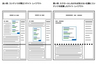 広告の配置に関するヒントの中で、スクロールしなければ見えない位置にコンテンツを配置したサイト レイアウトは悪い例として紹介されています。