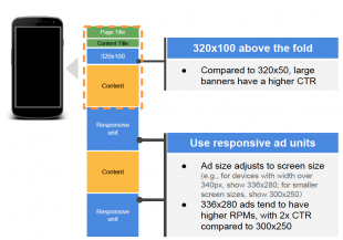 また、メインコンテンツの下に「336x280」(最もRPMが高い)「300x250」(他と比べてCTRが2倍)の広告ユニットを配置するのが最適と説明されています。