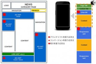 スマートフォンレイアウトにおける広告の配置に関しては「モバイルウェブ向けの最適化」で説明されているように、スクロールせずに見えるヘッダの下に「320x100」を配置します。