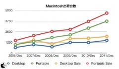 過去の同四半期と比較すると、Macintoshの場合、デスクトップは昨年同期よりも21%増加、ポータブルは昨年同期よりも28%増加、Macintosh全体の出荷台数は26%の増加となり、販売が好調だったことが確認できます。特にデスクトップの伸び率が回復傾向にあるようです。