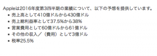 Appleは、2016年度第2四半期決算報告の中で、2016年度第3四半期の業績について、売上高として410億ドルから430億ドル、売上総利益率として37.5%から38%%と予測していましたが、その範囲内ということになります。