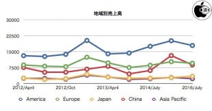Appleが、2016年度第3四半期の決算報告を発表しています。当四半期の売上高は424億ドル、純利益は78億ドル、希薄化後の1株当り利益は1.42ドル。前年同期の業績は、売上高が496億ドル、純利益が107億ドル、希薄化後の1株当り利益が1.85ドルでした。売上総利益率は、前年同期の39.7%に対し38%となり、当四半期の米国市場以外の売上比率は63%だったと報告しています。