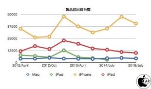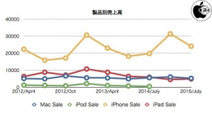 Apple Storeにおけるサードパーティ製アクセサリーの売上を加えたアクセサリーの売上に、Apple TV、iPod、Beats、Apple Watch製品が加わる「Other Products」は、昨年同期よりも16%減となっています。