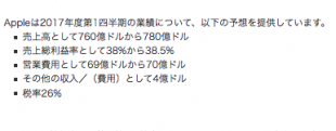 Appleは、2016年度第4四半期決算報告の中で、2017年度第1四半期の業績について、売上高として760億ドルから780億ドル、売上総利益率として38%から38.5%と予測していましたが、その予想範囲を超えたことになります。