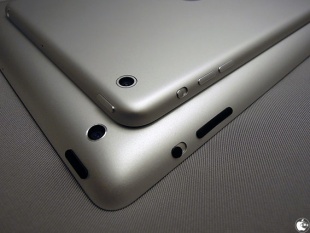 背面を比べてみると、iPad (4th generation)のAppleマークは、従来通り光沢のある素材がはめ込まれているのに対して、iPad miniは、iPhone 5/iPod touch (5th generation)同様に、アルミ筐体にエッチング処理されたAppleマークが入っています。