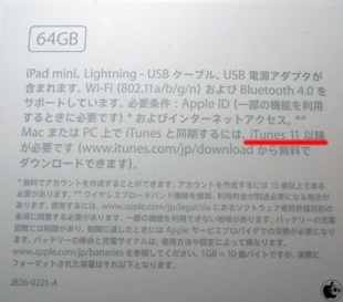 パッケージの裏面には、必要環境として「iTunes 11」以降と書かれています。