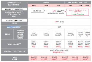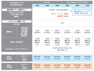 KDDIが、iPad mini with Wi-Fi + Cellular、iPad (4th generation) with Wi-Fi + Cellularの料金プランを発表しています。