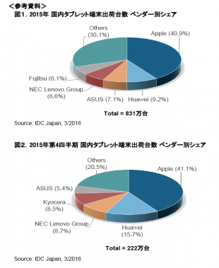 IDC Japanが、国内タブレット端末の2015年第4四半期(10月〜12月)および2015年通年(1月〜12月)の出荷台数を調査した「2015年第4四半期および2015年国内タブレット市場実績値」を発表しています。