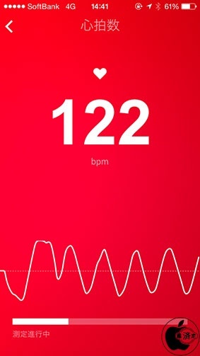 右上の+ボタンをタップして「心臓」タブでスタートボタンを押すと、iSightカメラに指先を軽く当てるだけで心拍数を計測することが出来ます。