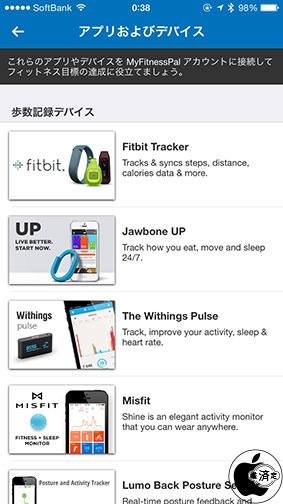MyFitnessPalは、iPhoneのモーションプロセッサからの歩数データーや、Jawbone UPや、Fitbit、Withingsなどのアクティブトラッカーと連携し、消費カロリー記録も行なう事が出来ます。
