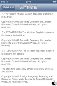 三省堂の辞書採用については、iOS 6の著作権情報に記載があります。