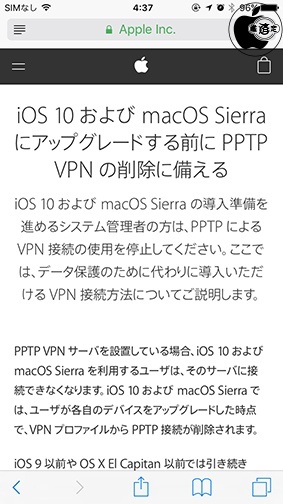 iOS 10から、ポイント・ツー・ポイント・プロトコル(PPP)を拡張したトンネリング・プロトコル「PPTP」によるVPN接続が出来なくなります。