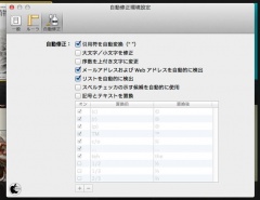 自動修正では、引用符の自動変換、大文字/小文字修正、序数を上付き文字に変更、メールアドレスおよび Web アドレスを自動検出、リストを自動的に検出、スペルチェッカーの示す候補の自動使用、記号とテキストの置換(個別指定可能)などが行えるようになっています。