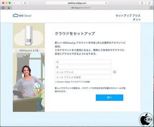 wdcloud.jp/setupにアクセスすると、セットアップアシスタントが表示されるので、氏名、メールアドレスを入力して、WD Cloudドライブを登録します。