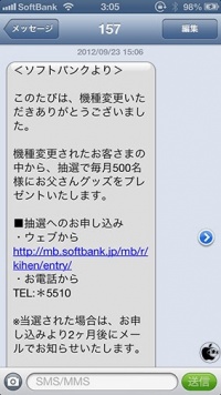 私の場合は2012年9月23日付けに送られてきていた「このたびは、機種変更いただきありがとうございました。機種変更されたお客さまの中から、抽選で毎月500名様にお父さんグッズをプレゼントいたします。」というメッセージにある「http://mb.softbank.jp/mb/r/kihen/entry/」にアクセスすると、特典申込サイトに進めました。