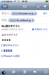 逆に、auから、通常、他のキャリア同士でも使用可能な絵文字を使って送信してみたところ、au側が、i.softbank.jpアカウントへの自動変換送出しを提供していないため、iPhone 3Gでは文字化けします。
