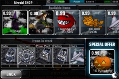 トップ画面のSHOPをタップすると、戦闘機やミサイル、スペシャルアイテムなどを購入することが出来るようになっています。