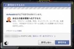 最初に、Facebookへのログイン画面が表示され、FacebookのAirRaid2010とのコネクションを成立させます。