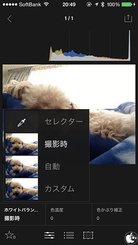 左から1番目のアイコンをタップすると、Adobe Lightroom 5.4が持つ基本補正機能、ホワイトバランス、色温度、色かぶり補正がリスト表示されます。