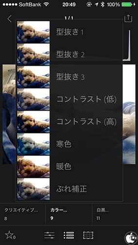 各補正項目をタップすると、プリセットリストが表示され、選択するだけで補正効果をかけることが出来ます。