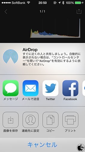 写真選択または写真のルーペ表示している場合、右上のアイコンをタップすると、iOS 7の共有機能を呼び出す事が可能で、AirDrop共有や、TwitterやFacebook投稿、プリントなどを行う事が可能となっています。