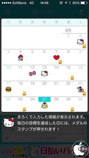 カレンダーを表示すると、毎日の目標を達成した日には、メダルのスタンプが押され、目標達成状況を確認することが出来ます。