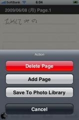画面左下のアクションボタンをタップすると、メモ帳の削除、追加、写真ライブラリへの保存を行なうことが出来ます。