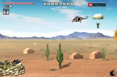 左のプレイヤーは、ロケット弾と対空機関銃をタップして切換えて、ヘリコプターや落下傘部隊、地上兵を倒していきます。