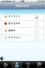 状態をタップすると「オンライン、取り込み中、退席中、オフライン」が表示されるので、他者のWndows Live メッセンジャー上で表示される状態をコントロールすることが出来ます。