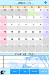 カレンダーは、リスト、日、週、月単位で表示を切り替えることが出来ます。