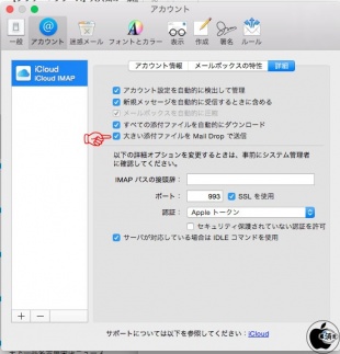 Mail Drop経由でファイル送信したくない場合は、メールの環境設定>アカウントの詳細タブにある「大きい添付ファイルを Mail Drop で送信」のチェックを外します。