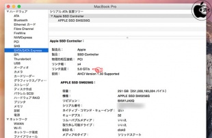 PCIe SSDのリンク幅は「x4レーン」で、フラッシュストレージは、Samsung製「APPLE SSD SM0256G」が搭載されています。