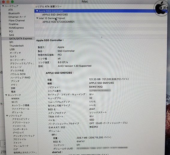 2TB Fusion Driveの場合、サムスン製の128GB SSDが採用されていて、Serial ATA Express準拠のPCI Express Gen.3 x4接続(PCI x4、リンク速度8.0GT/s)で接続されています。