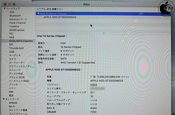 1TB Fusion DriveのHDDは、Seagate Desktop HDD ST1000DM003(7200rpm)が採用されていました。