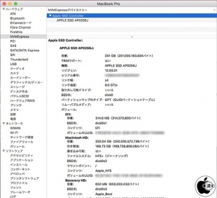 フラッシュストレージは、NVM Express接続(リンク幅x4 リンク速度8.0 GT/s)の「APPLE SSD AP0256J」(256GB)で、MacBook (Retina, 12-inch, Early 2016)のNVM Express接続(リンク幅x2 リンク速度8.0 GT/s)の「APPLE SSD AP0256J」(256GB)と比べ、直付けSSD仕様は同じですが、接続性能が異なります。