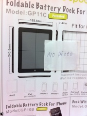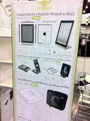 展示パネルを見てみると、iPhone 5 & iPad2でも使えるという「Foldable Battery Dock For iPhone 5 & iPad2」というバッテリー搭載スタンドなど、Dock搭載バッテリー周辺機器をメインにした展示を行っていました。