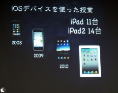 学校に導入しているiPadは、iPadを11台、iPad 2を14台で、2人で1台を共有しながら授業を行っているそうです。