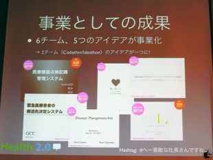 Health 2.0の事業では、6チームから5つのアイディア出てきたと話し、その後、アメリカの医療Hackathonで問題を可視化して寄付募るアイディアで優勝したと話した。