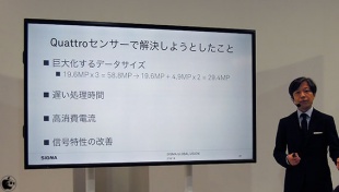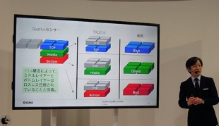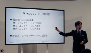ボトム1:ミドル1:トップ4 の「1:1:4」構造を採用した、Foveon X3 ダイレクトイメージセンサー「Quattro」についての説明に、多くの時間が割かれた内容でした。