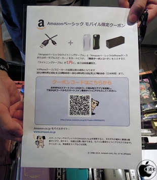 会場では、来場者限定で「Amazonベーシック モバイル限定クーポン」をゲット出来るチラシを配っていて、そのクーポンを使用する事で、AmazonベーシックのiPhoneケースまたはポータブルスピーカーと一緒に購入すると、Amazonベーシック ライトニングケーブル 約90cm