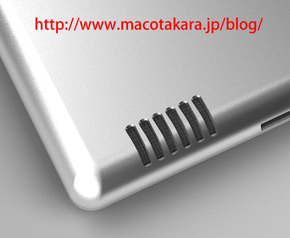 液晶面を前にして、右下背面に開けられている穴は、SDカードスロットやUSBスロットでは無く、大型化されたスピーカーユニットが配置されており、メッシュパーツがはめ込まれているようで、現在のiPadよりも、高音質な音が鳴るようになっているようです。