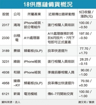 TSMCはA11チップの製造を6月から開始し、Foxconn、Pegatron、Wistronも製造トレーニングを始める予定で、Zhen Ding Technologyや、Kinsus Interconnect Technologyは、7月末からプリント基板製造を開始、Simplo Technologyは、6月からバッテリー製造を開始する予定のようです。
