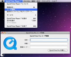 なお、Mac OS X Snow LeopardのQuickTime 7は、Mac OS X Leopardで使用していたProコードを引き継いで使用可能で、Proコードを利用されていない方は、別途Proコードを購入し、QuickTime Player 7 のドロップダウンメニューをクリックして「ユーザ登録」を選択してProコードを入力することでQuickTime Pro 7として使用出来ます。