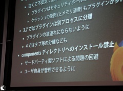 また、プラグインを別プロセス管理することで安定させ、Firefox 4ではタブ毎に分離することも出来ると説明していました。