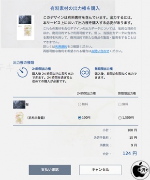 料金は、制作したデザインを出力する場合、24時間以内なら1素材に付き100円で、イラスト1,000円または写真1,500円で購入すると期限制限なしに出力できます。