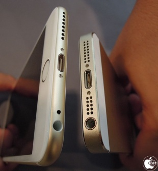 iPhone 5sとiPhone 6 Plusの底面部を比べてみると、Lightningコネクタの外周がより薄くなり、また、ヘッドフォンジャックの外周部分も薄くなっていることが確認出来ます。