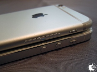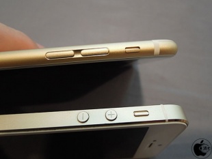 iPhone 5sとiPhone 6のサウンドオン/オフボタン側を重ねてみました。