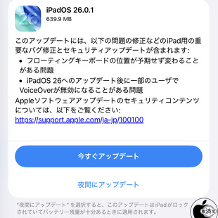 Apple、いくつかのバグを修正した「iPadOS 26.0.1」を配布開始