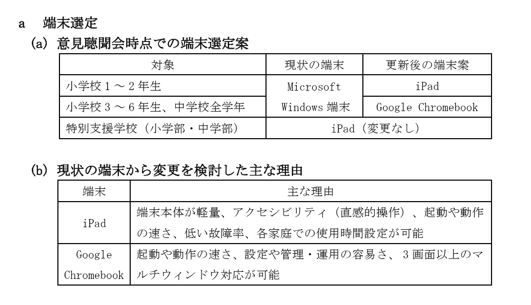 小学校・特別支援学校の学習者用端末としては「iPad (A16)」が選定されていて、中学校の学習者用端末としては「NEC社製Chromebook Y4」が選定されています。