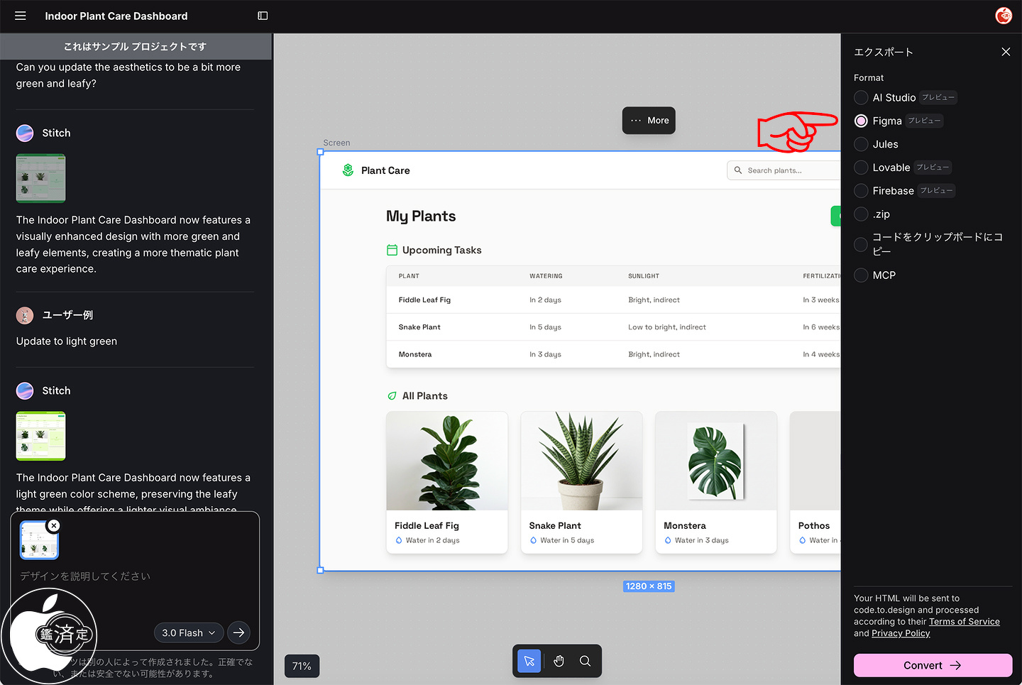 Stitch の任意のエージェントからデザインを直接 Figma にエクスポートでき、エディタブルなレイヤーとして使用できるようになりました。